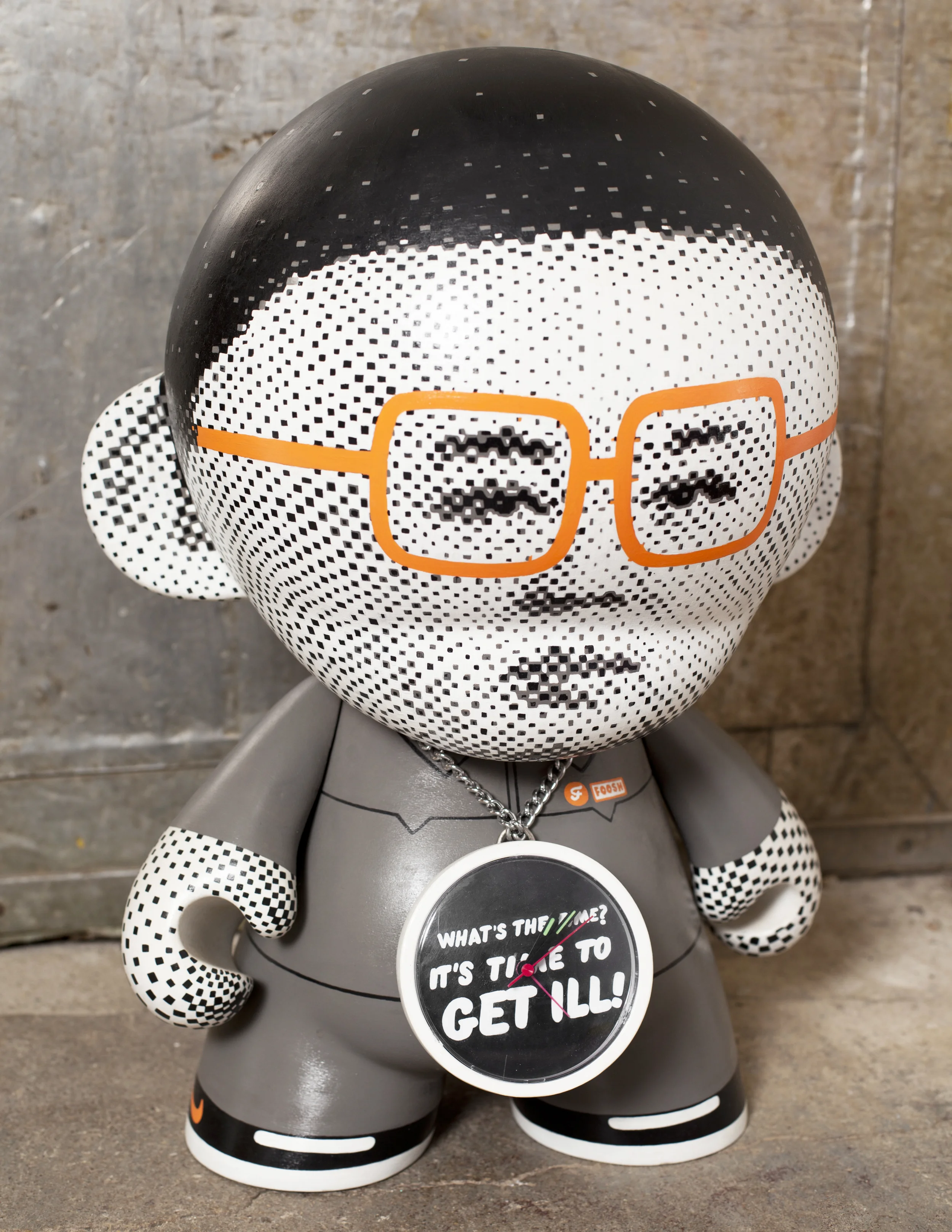 Foosh is one of my favorite shops, run by 2 great guys Rob and Justin. For their 10th Year Anniversary, they asked that I customize their famous Kim Jong Il design on a mega munny. The project took a full month of tediously painting each pixel one by one (often 3-4times each to bring out the depth). Half way through, I thought to myself, what on earth did I get myself into!! When it was all done, I couldn’t be more happy seeing how people received him at the shop. He’s now a staple at Foosh, and I’m very honoured I was able to bring him to life